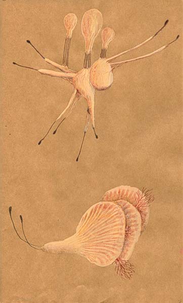 Silicone, drafting paper, organza fabric, oil paint, perspex, wooden box, dowel, metal jewellery findings and electrical light elements.